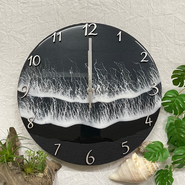 夜の海をイメージして、黒をベースに仕上げました。 砂浜に打ち寄せる2層の白波がとても印象的です。 文字盤の数字はシルバーカラーで、落ち着いた雰囲気の中にも上品さをプラスしています。 *48時間試運転済み サイズ 直径28cm ★必ずご覧いただくようお願い申し上げます★ ◇一つ一つ丁寧に作ってはいますが、気泡やホコリ、凹凸がある場合がございます。 商品画像をよくご覧になり納得したうえ、ご購入をご検討下さいませ。 ◇レジン作品の管理には充分お気をつけ下さい◇ ★直射日光が長時間当たる場所や、高温になる場所には置かないようお願い致します。 ★レジンの表面が汚れた場合 高濃度のアルコールや洗剤の使用はお避けください。 柔らかい布等で優しく水拭きをお願い致します。 ★レジン表面は傷が付きやすいので取扱にはお気をつけください。 ★レジンアート作品を壁掛けなどにする際、釘やビスをお使いになられる場合は充分お気をつけ下さい。 ◇お使いの端末状況により商品画像の色合いが違って見えることがございます。 ◇ご購入後の商品の返品、クレームは一切受け付けておりませんので、ご了承下さいますようお願い申し上げます。