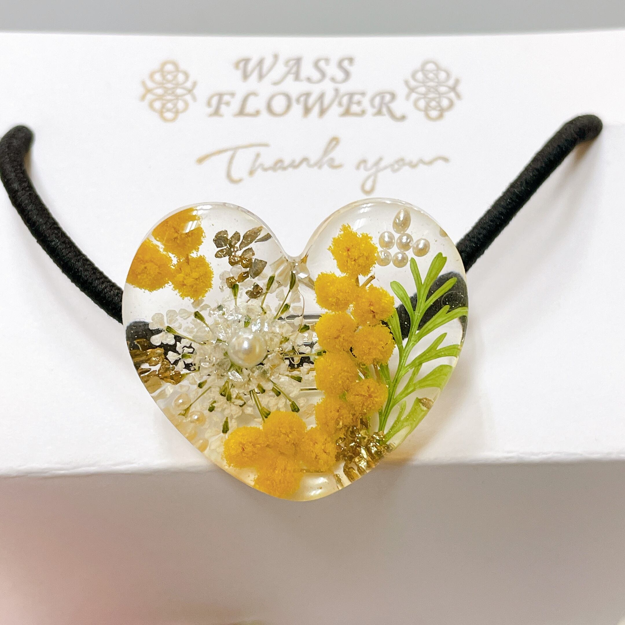 可愛いハートの形の中にミモザ、レースフラワーのお花が入ったヘアゴムです。