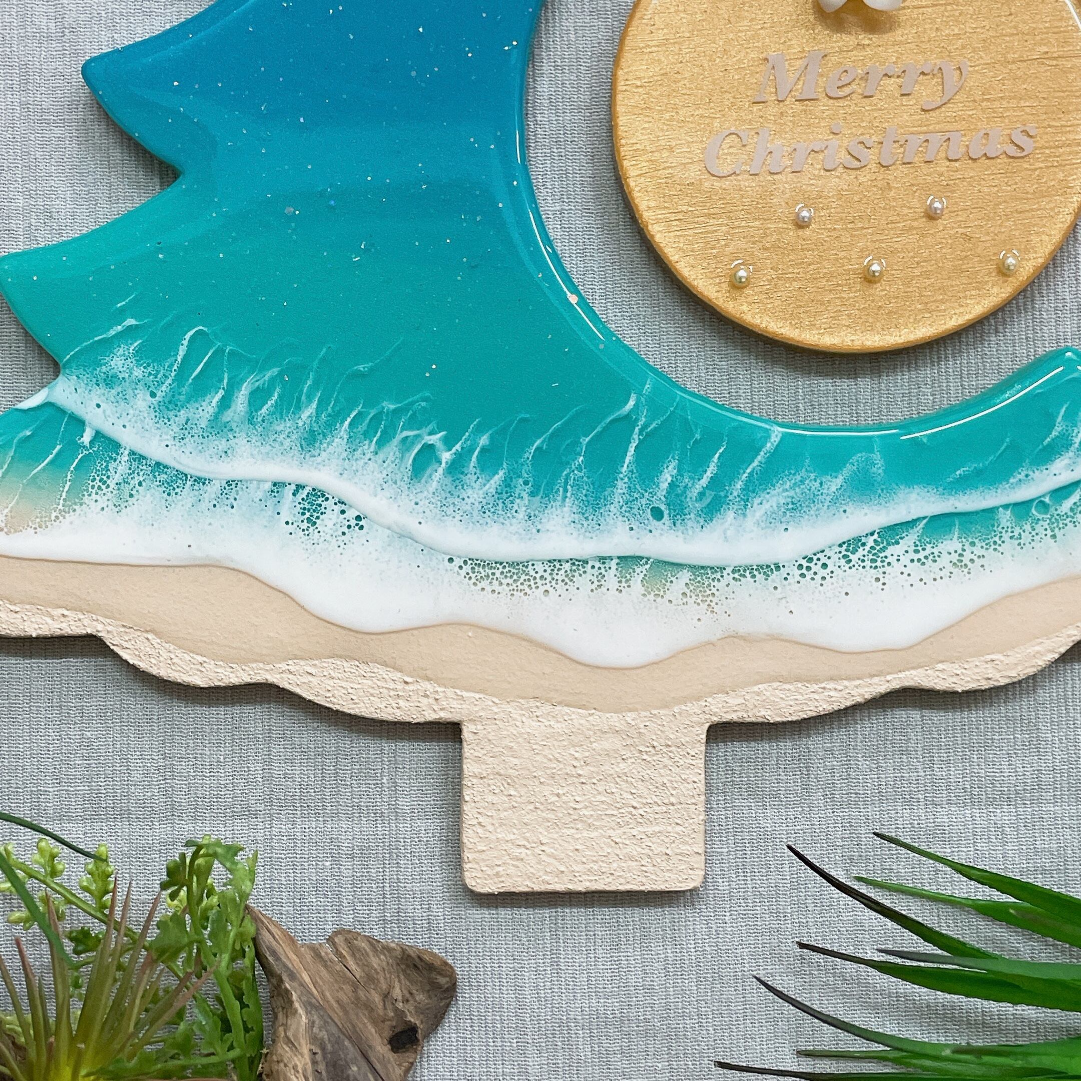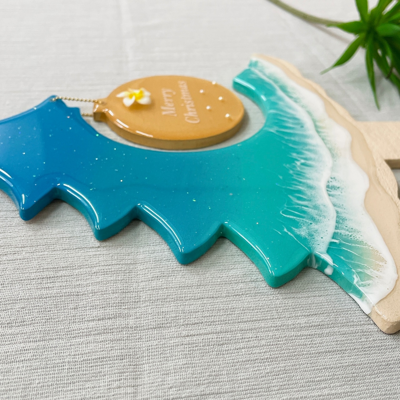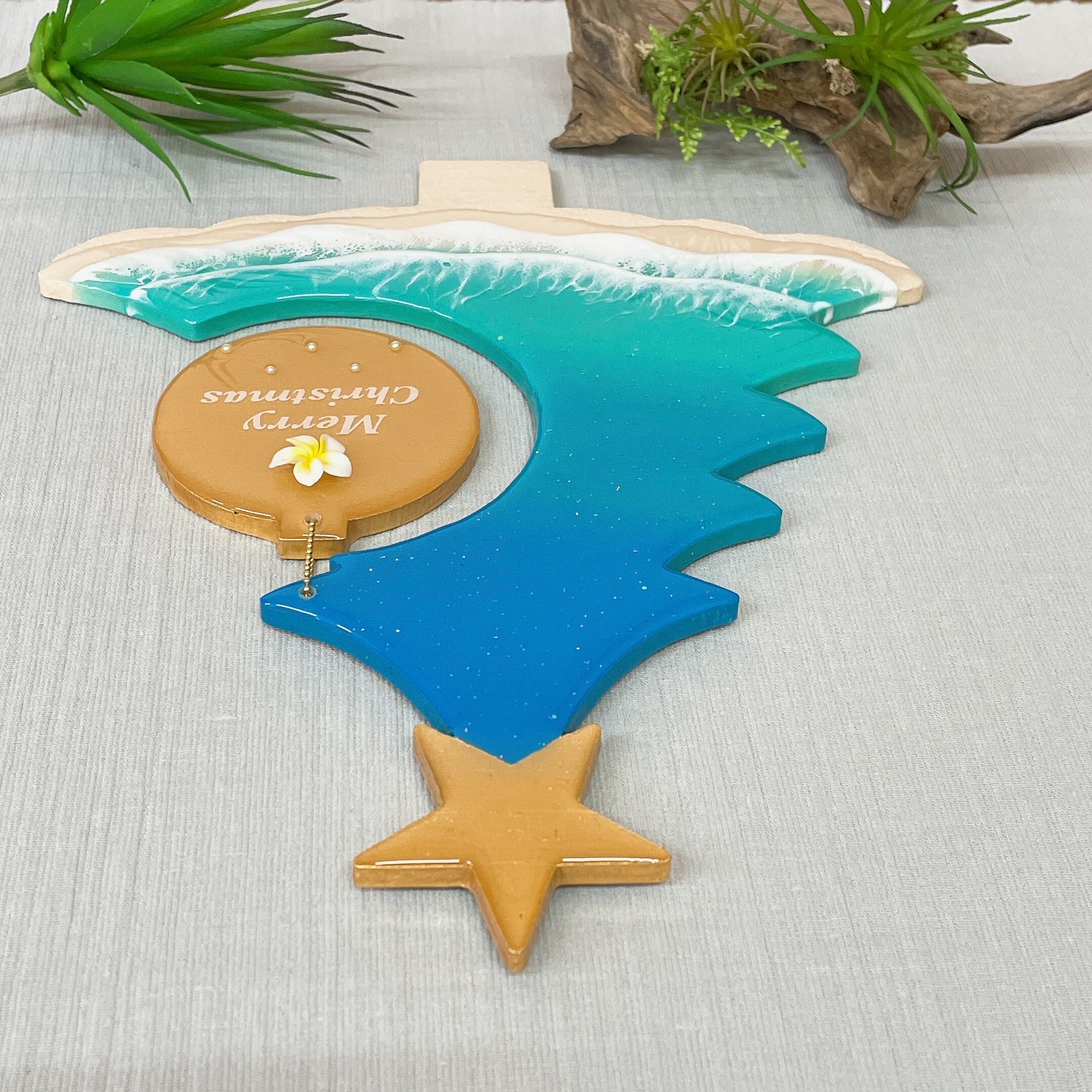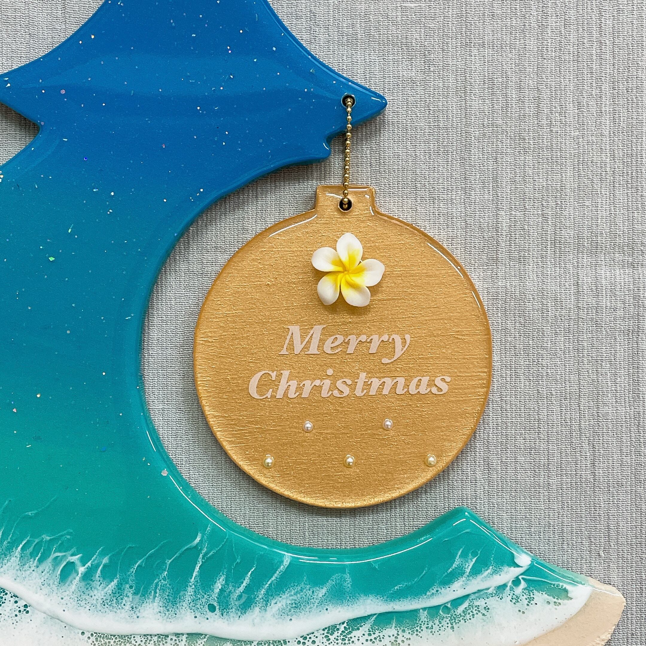 クリスマス ボール オーナメントはゴールドにしてMerry Christmasの文字とプルメリア、小さなホワイトとイエローのパールを飾りました。