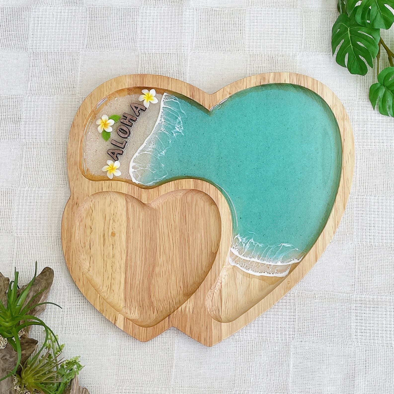 重なったハート型の木製トレイに海をレジンアートで表現しました。